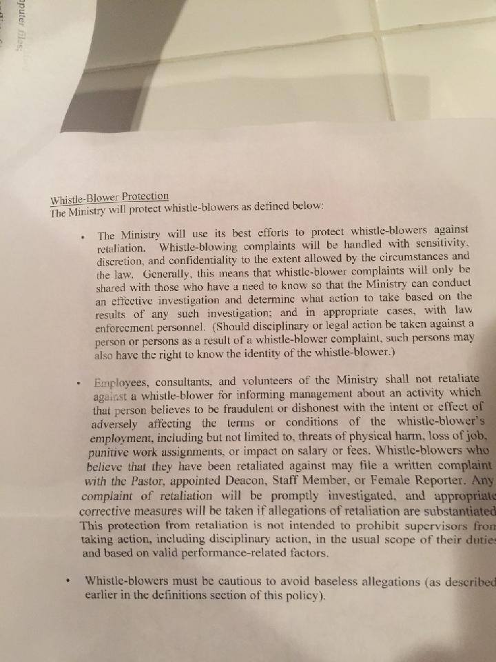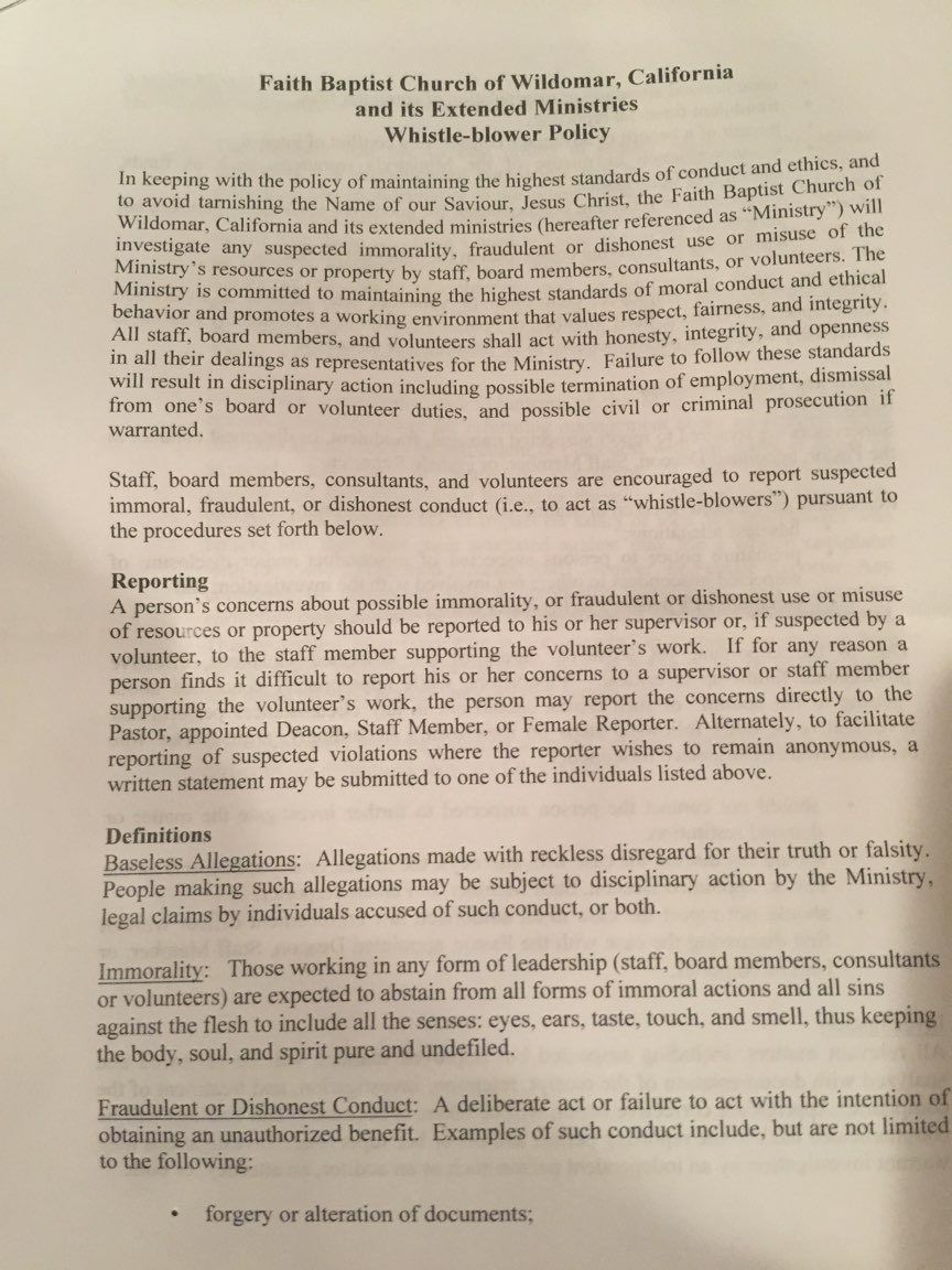 In January 2020, a former member and victim of abuse from Faith Baptist Wildomar shared the church's three page "Whistle-blower Policy."